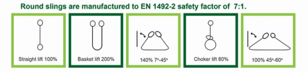 يتم تصنيع حبال الرفع الدائرية (Round Slings) وفق المواصفة الأوروبية EN 1492-2 وبعامل أمان 7:1. يتم لف الألياف الحاملة للحمل معًا لتشكيل حلقة لا نهائية، ويتم تحديد حد الحمل التشغيلي (WLL) بناءً على عدد اللفات داخل الحلقة.